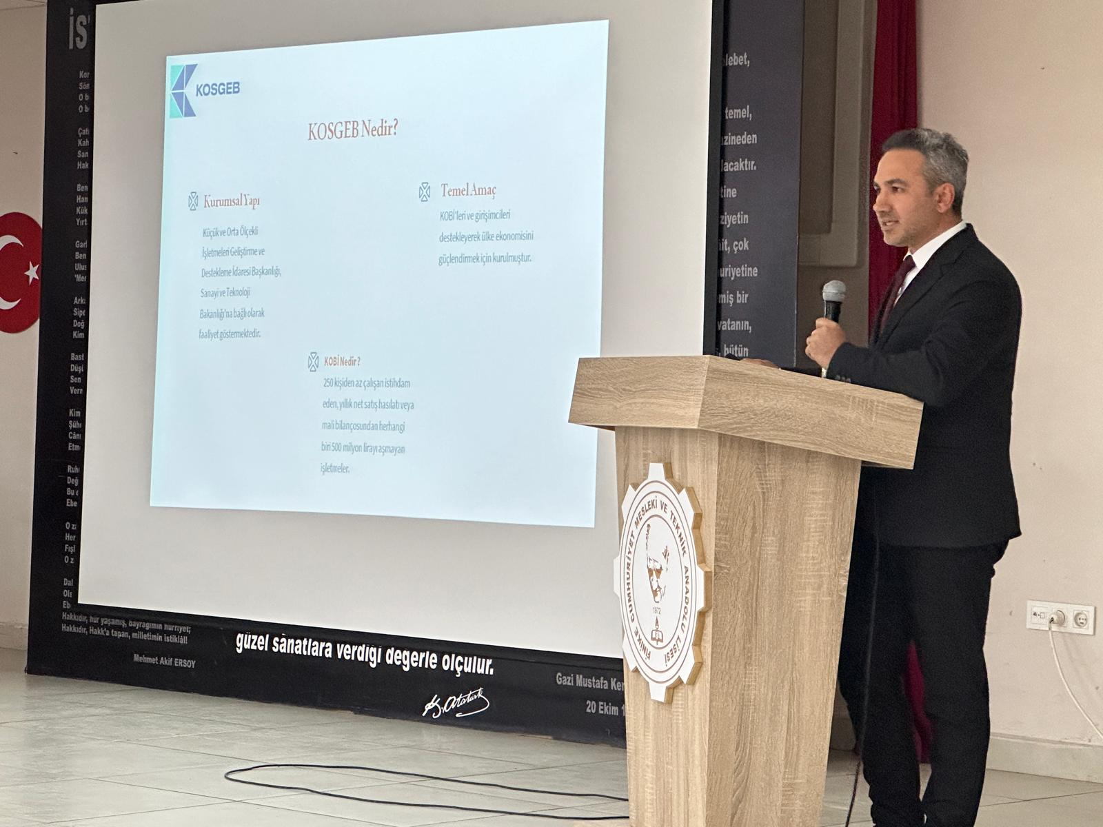 Seminere katılan meslek lisesi öğrencileri, iş kurma süreçleri, resmi prosedürler ve devlet destekleri hakkında kapsamlı bilgilerle donatıldı. Programda, Kumluca Ticaret ve Sanayi Odası (KUTSO) adına konuşma yapan Oda Sicil Müdürümüz ve KOSGEB Temsilcimiz Recep Kösek, öğrencilere;