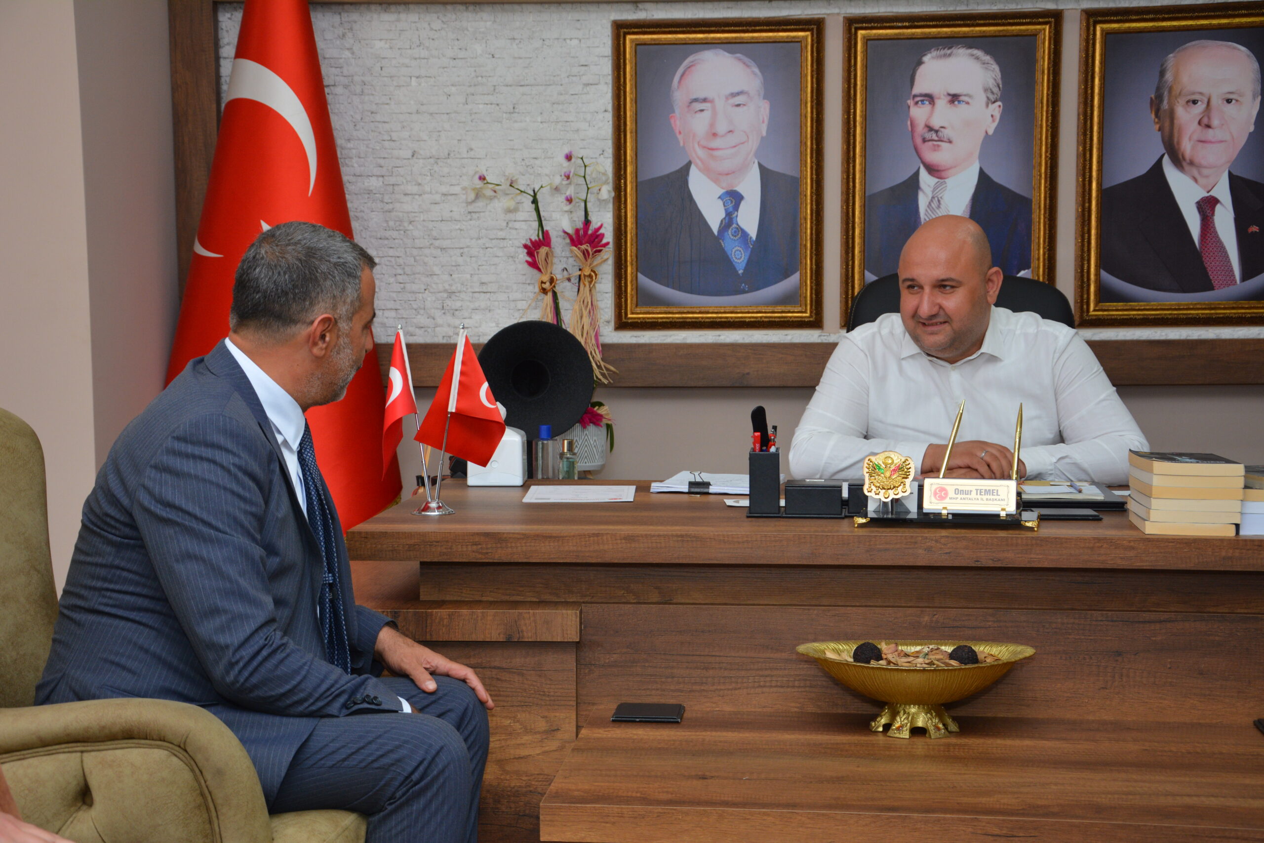 Yönetim Kurulu Başkanımız Fahri ÖZEN, Meclis Başkanı Menderes OKTAY, Başkan Yardımcıları Bayram KARAGÜL, İsmail ÖNAL Yönetim Kurulu Üyeleri Fatih Mehmet ATEŞ, Şükrü AÇIKYÜREK, Oğuzhan ONUR, Ramazan AKASMAN, Disiplin Kurulu Başkanı Mevlüt TUĞ ve Genel Sekreter Mesut BAKAR, Milliyetçi Hareket Partisi (MHP) 14.İl Kongresi sonucunda yeniden seçilerek güven tazeleyen İl Başkanı Onur TEMEL ve il yönetim kurulu üyelerini Antalya İl binasında ziyaret ederek tebrik ettiler.