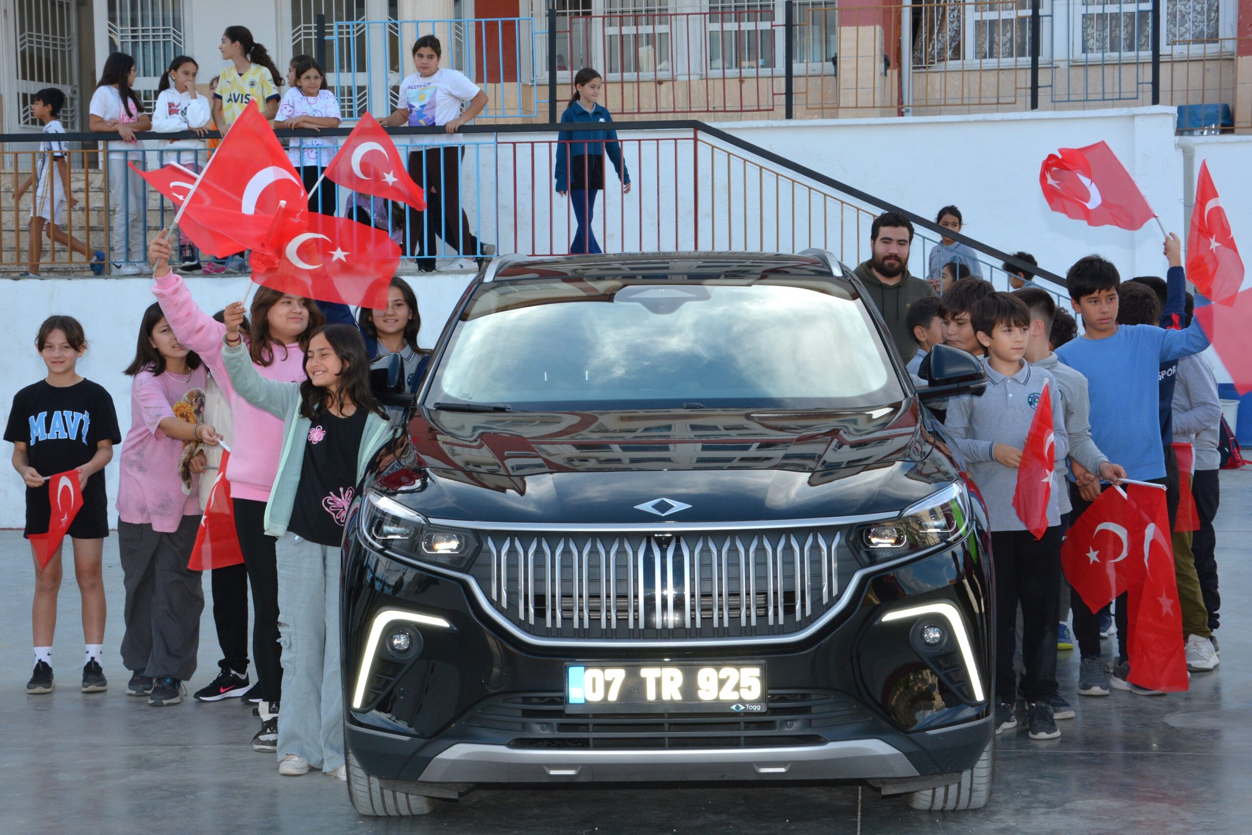 Türkiye’nin yerli otomobili TOGG’un T10X Oltu Siyah modeli, Finike ve Demre’deki ilkokul, ortaokul, lise ve özel okul öğrencilerine tanıtıldı. Öğrenciler, okul bahçesindeki aracın detaylarını inceledi, fotoğraf çektirdi.