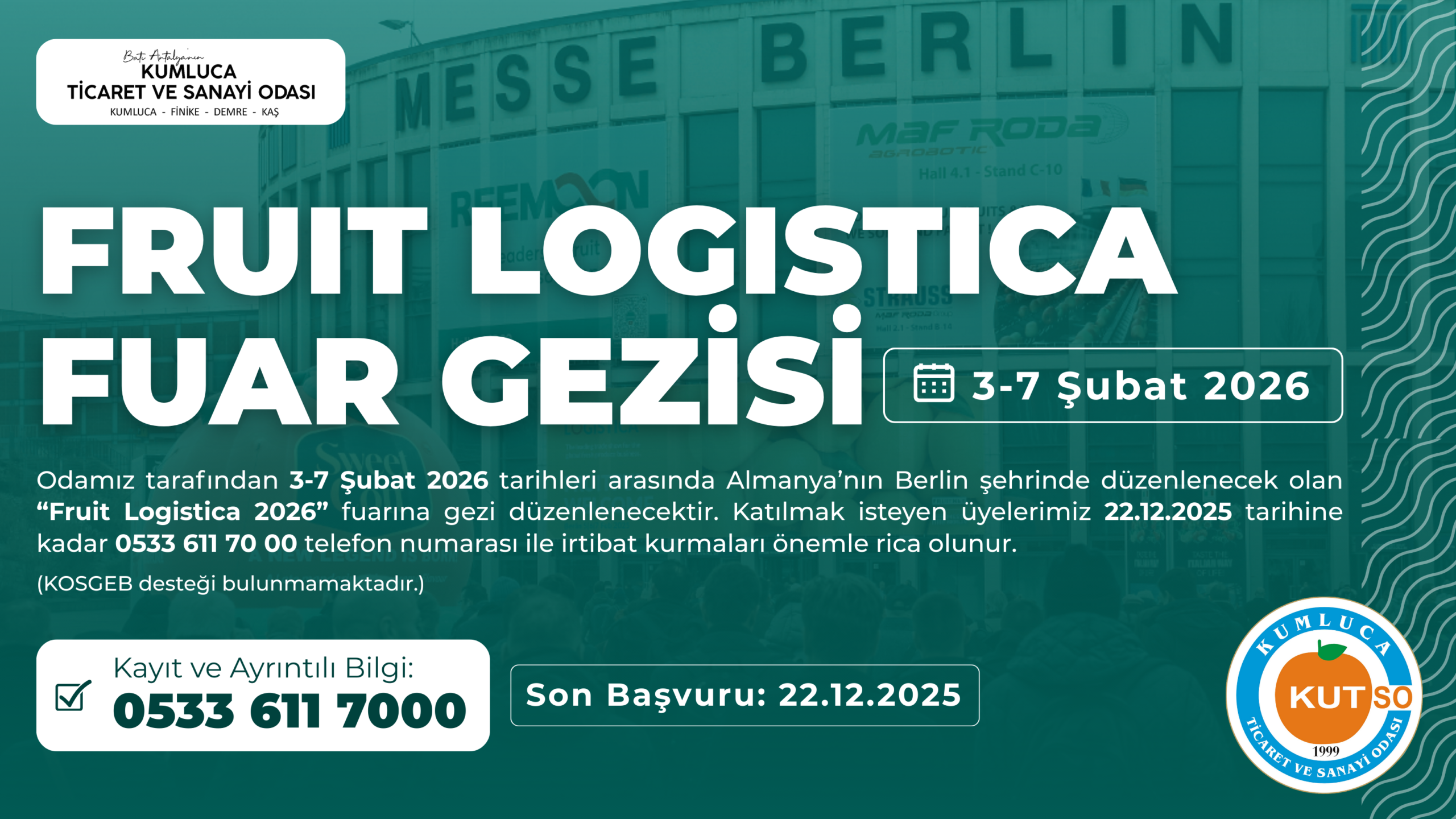 Odamız tarafından, 3–7 Şubat 2026 tarihleri arasında Berlin / Almanya’da düzenlenecek olan Fruit Logistica 2026 Uluslararası Meyve ve Sebze Fuarı’na yönelik bir yurt dışı gezi organizasyonu düzenlenecektir.