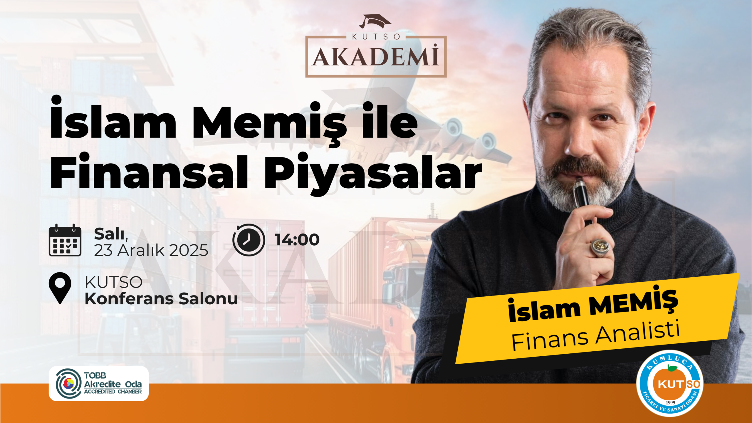 KUTSO Akademi kapsamında, finans dünyasının yakından takip edilen isimlerinden İslam Memiş’in katılımıyla düzenlenecek programda; küresel ve yurtiçi piyasalardaki güncel gelişmeler, yatırım araçları, doğru yatırımcı profili ve finansal okuryazarlık konuları ele alınacaktır.