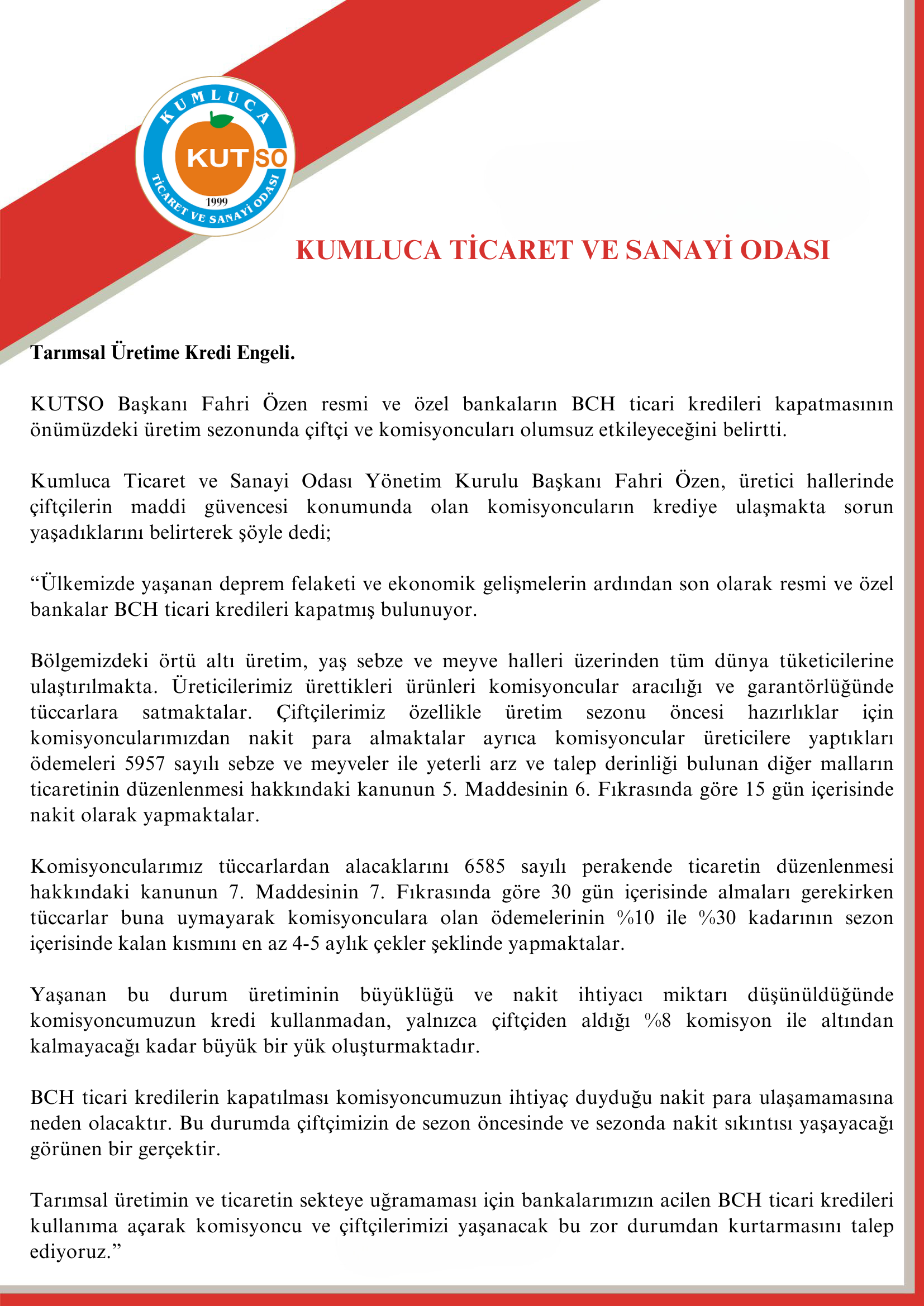 KUTSO Başkanı Fahri Özen resmi ve özel bankaların BCH ticari kredileri kapatmasının önümüzdeki üretim sezonunda çiftçi ve komisyoncuları olumsuz etkileyeceğini belirtti.